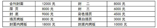 2、展會會刊:免費(fèi)刊登全部參展商名錄及企業(yè)簡介。文字內(nèi)容以回執(zhí)表或郵件為準(zhǔn),會刊為32開(規(guī)格為210mm×142mm)銅板彩印,刊登廣告采取自愿原則,收費(fèi)標(biāo)準(zhǔn)如下: